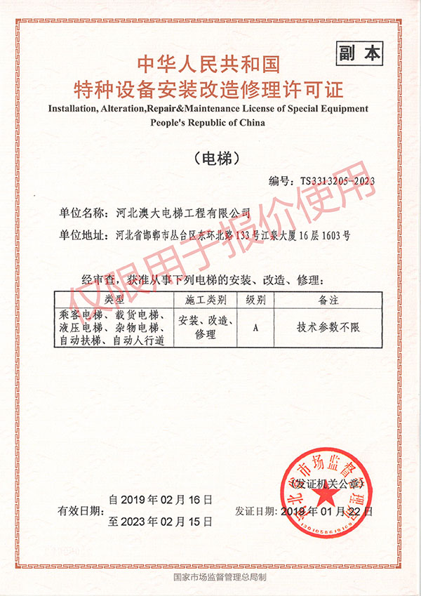 河北澳大電梯工程有限公司是集電梯銷售、安裝、維護保養(yǎng)為一體的專業(yè)化電梯公司。公司具有國家質(zhì)量監(jiān)督檢驗總局頒發(fā)的“電梯安裝改造維修A級”資質(zhì)許可證。下設(shè)市場部、工程部、維保部、技術(shù)部、行政部及電梯配件公司。